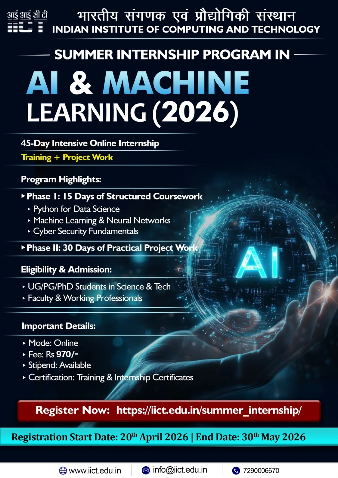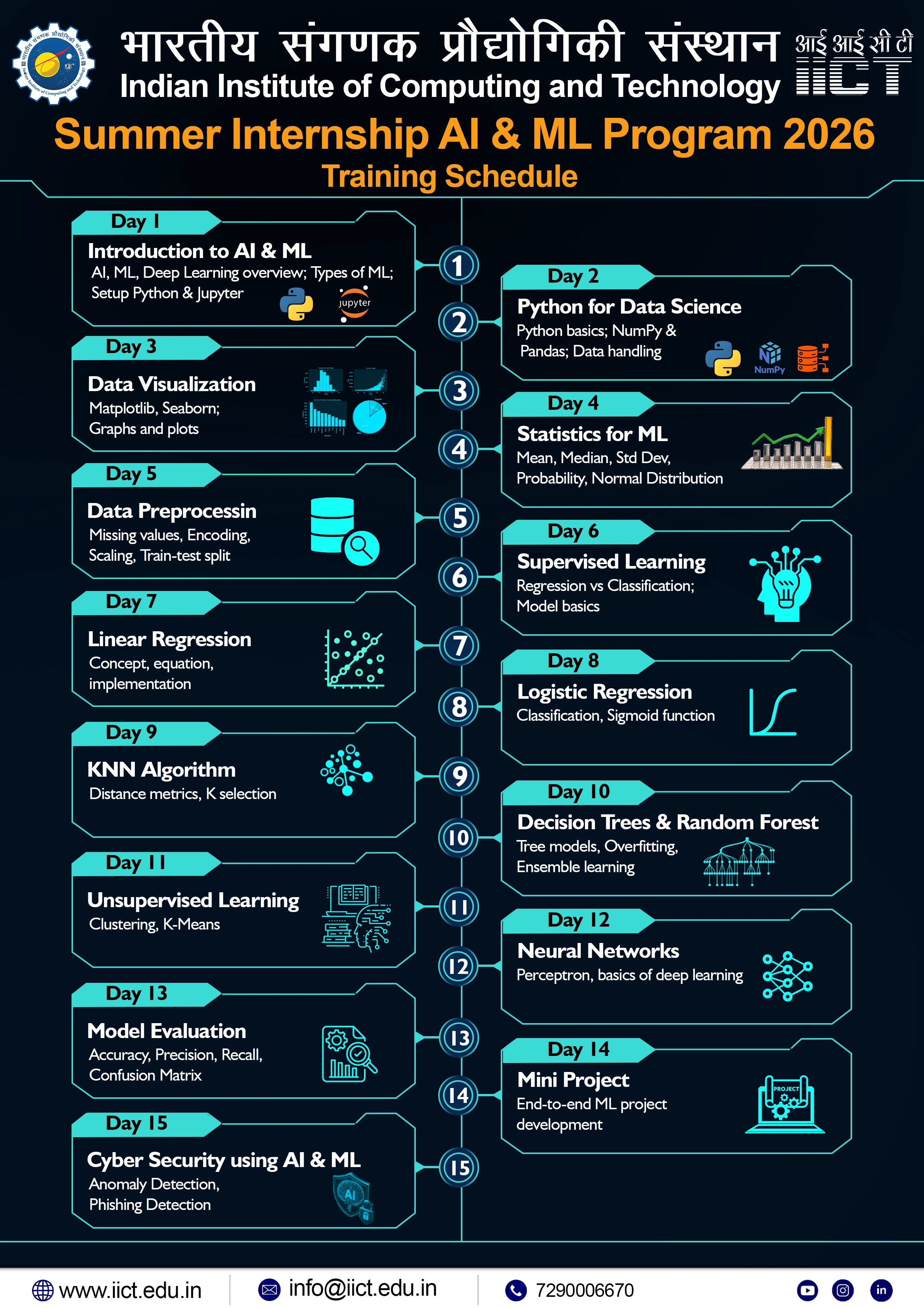 The Indian Institute of Computing and Technology (IICT) is pleased to announce its comprehensive 45-day Summer Internship Program focusing on Artificial Intelligence (AI) and Machine Learning (ML). This program is designed to bridge the gap between theoretical knowledge and practical application, offering participants a robust foundation in one of the most transformative fields of modern technology.